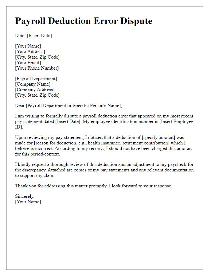 Have you ever checked your paycheck and found unexpected deductions? It can be confusing and frustrating, especially when it feels like your hard work isn't being fully recognized. Disputing payroll deduction errors doesn't have to be daunting; with the right approach, you can navigate the process smoothly. So, let's explore how to effectively draft a letter to address these discrepancies and ensure you receive what you rightfully deserveâread on for our helpful tips!